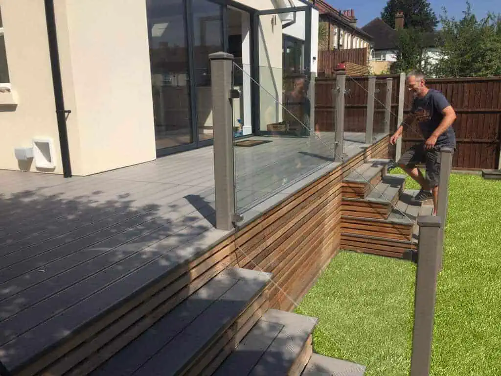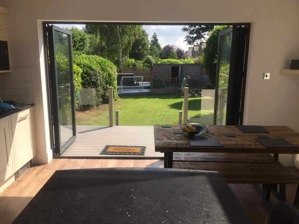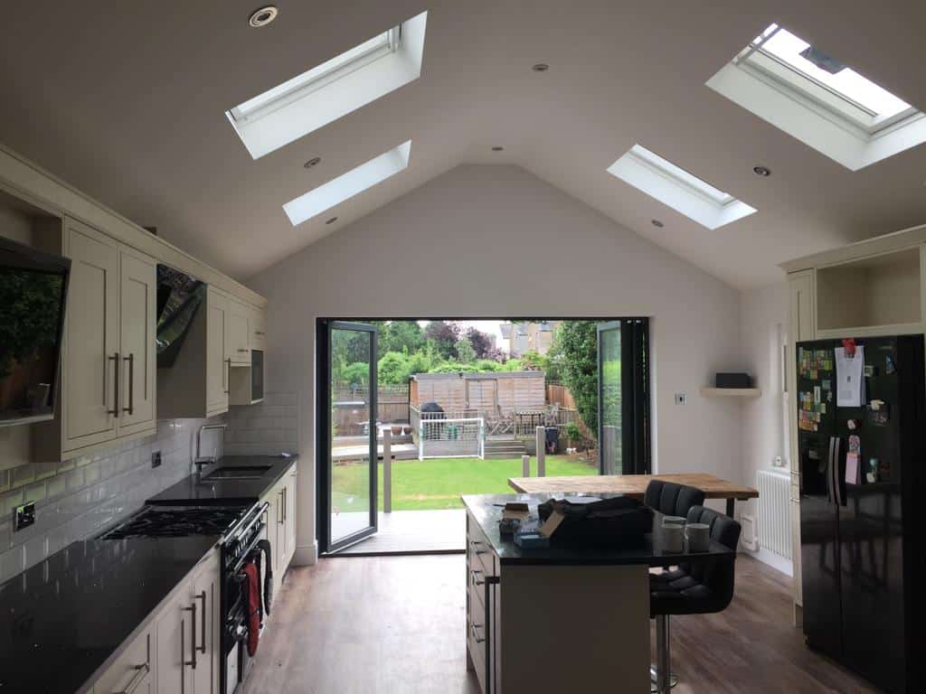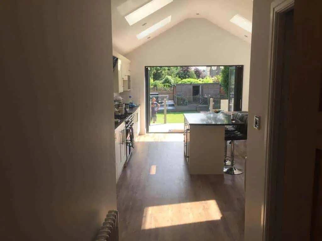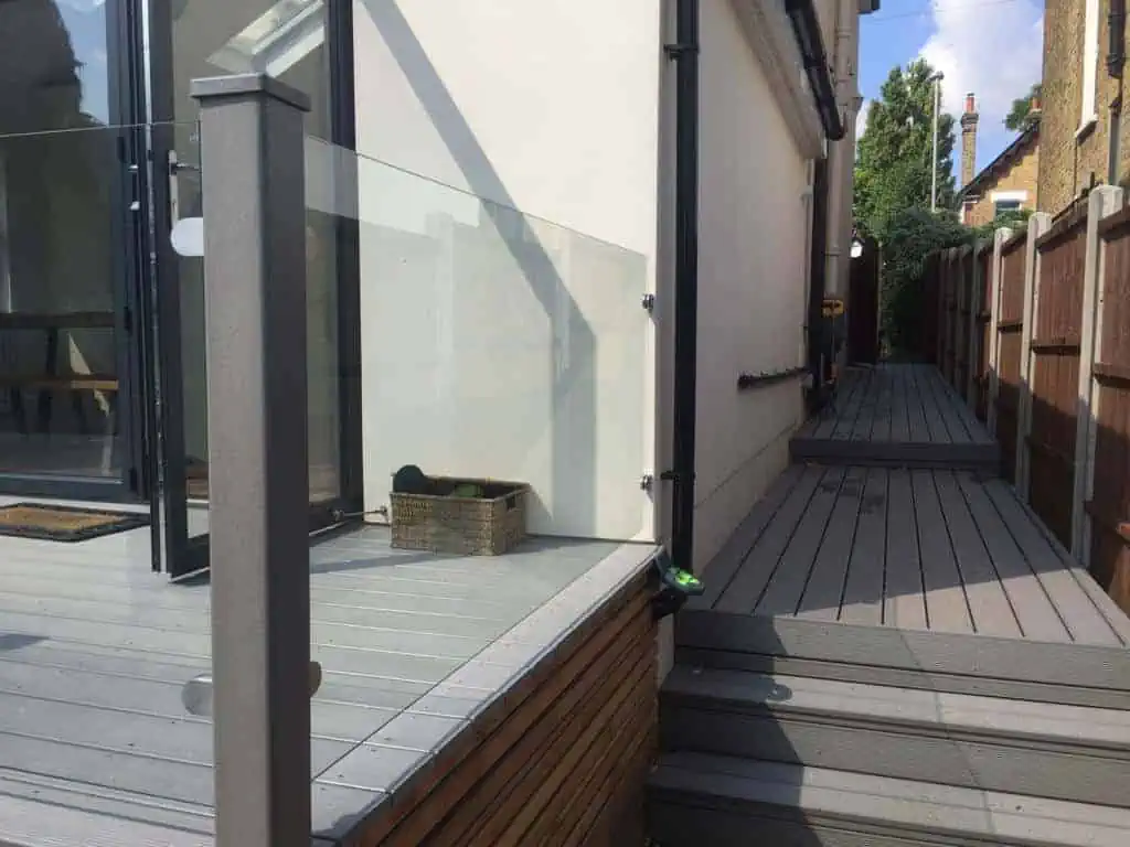 By M&C ConstructionThis was an extensive job involving a large extension on the rear of a semi-detached house in Wallington which featured a large kitchen with breakfast bar which had a pitched roof with skylights and inset lighting. Bifold doors opened up onto a large, stylish deck area which flowed down the side of the extension allowing for an ample outside dining area and stepped down into the garden. The deck had a glass balustrade and was coloured grey with complimentary wood highlights.